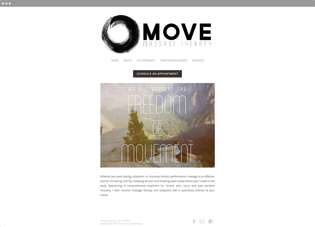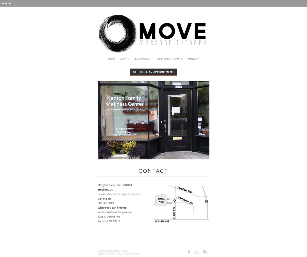Move Massage Therapy is a private bodywork practice located in Portland, Oregon. The website needed to reflect the owner's inclusive mission of providing therapy to a wide range of clientele.