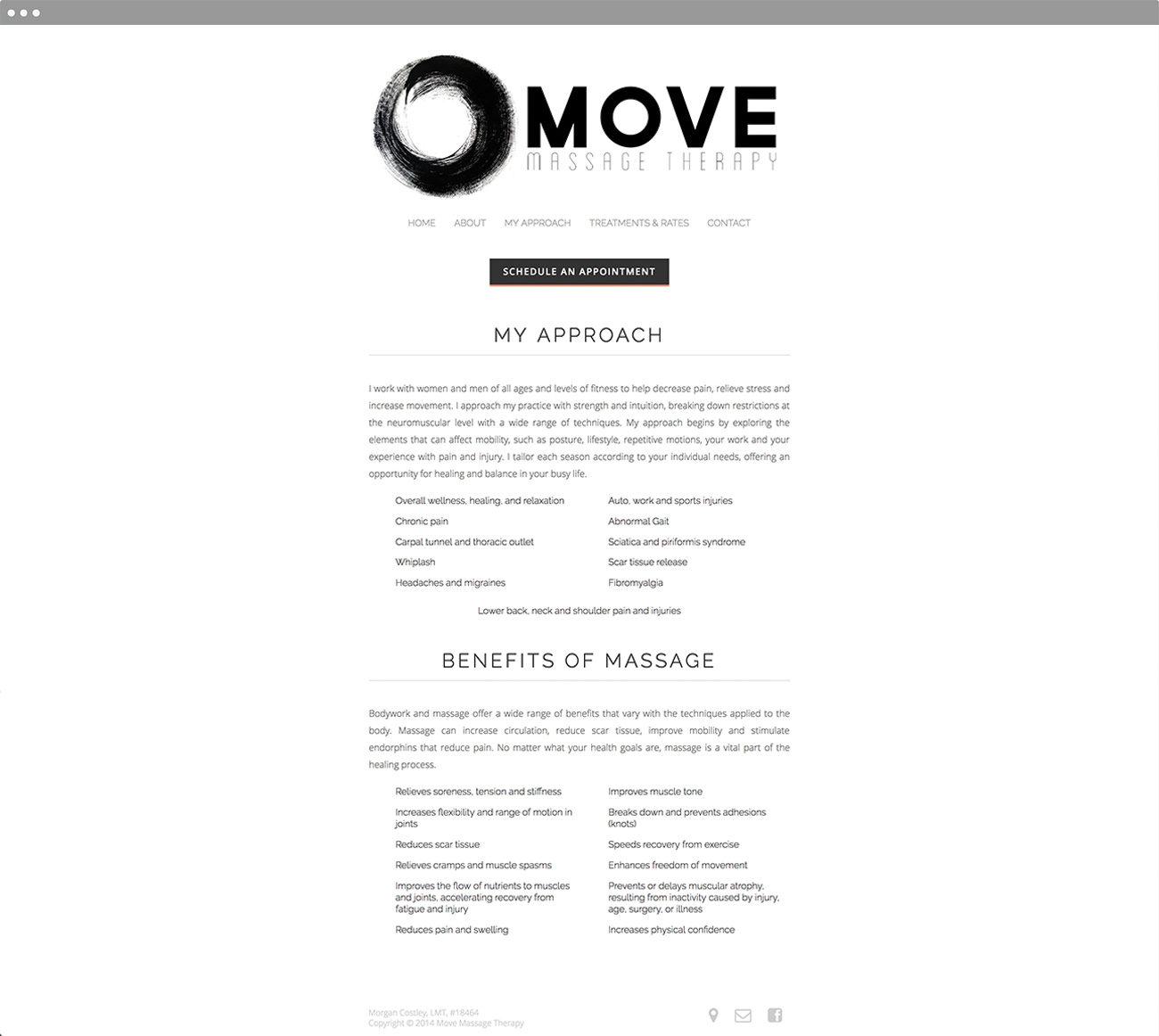 Move Massage Therapy is a private bodywork practice located in Portland, Oregon. The website needed to reflect the owner's inclusive mission of providing therapy to a wide range of clientele.